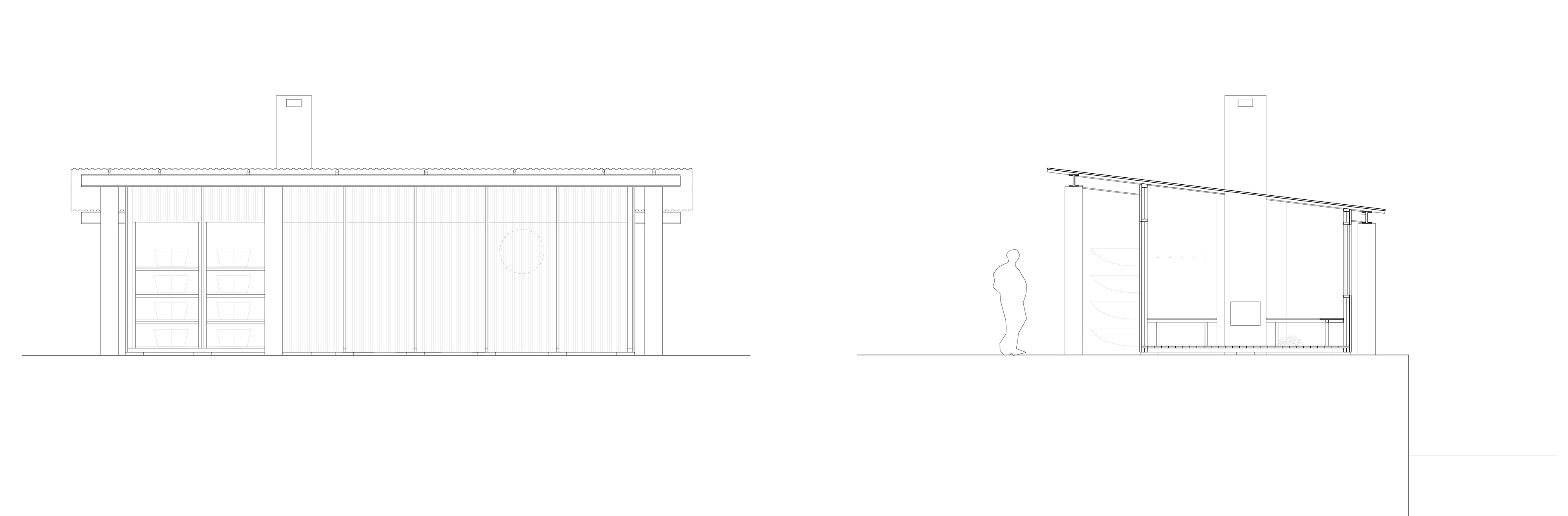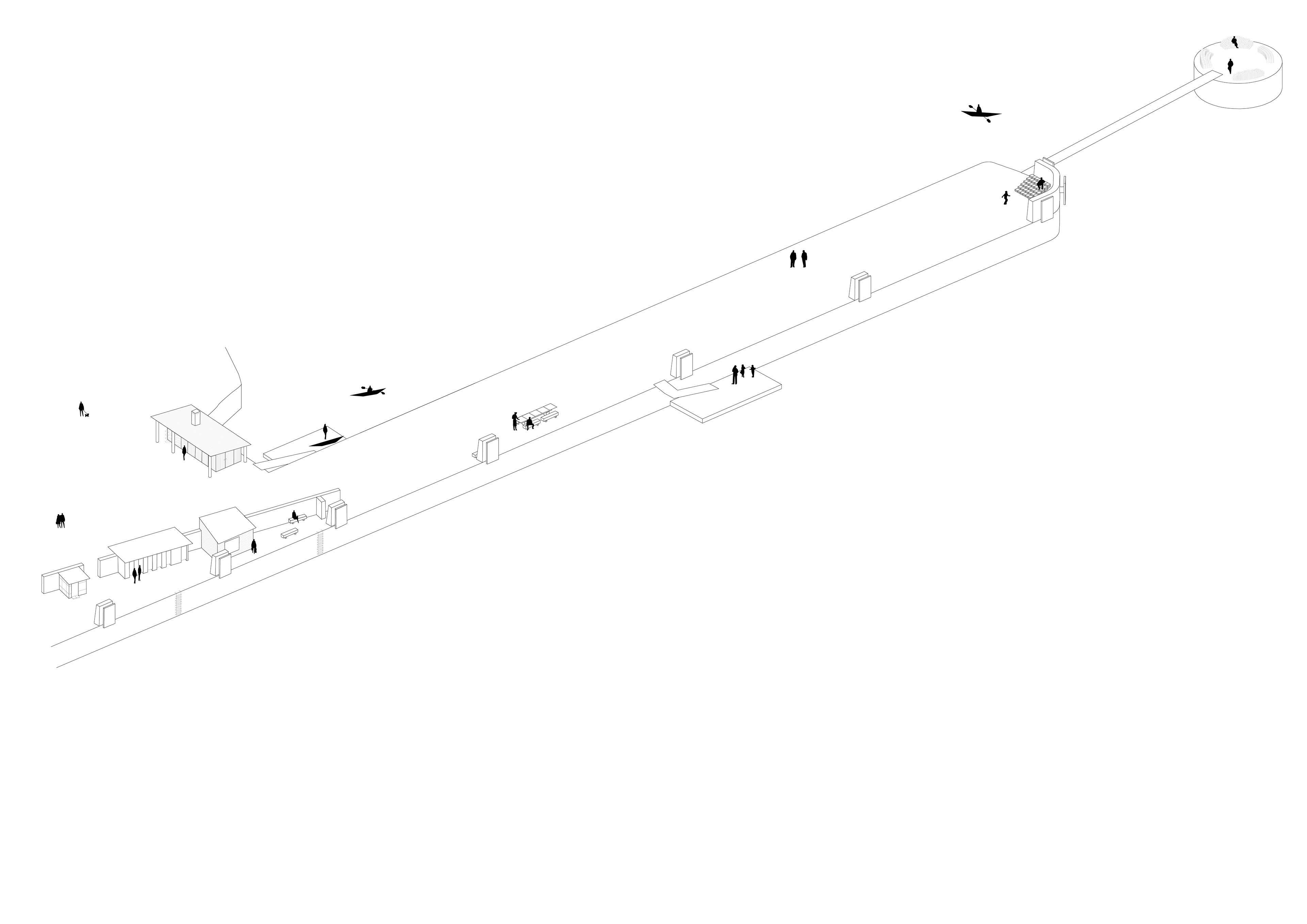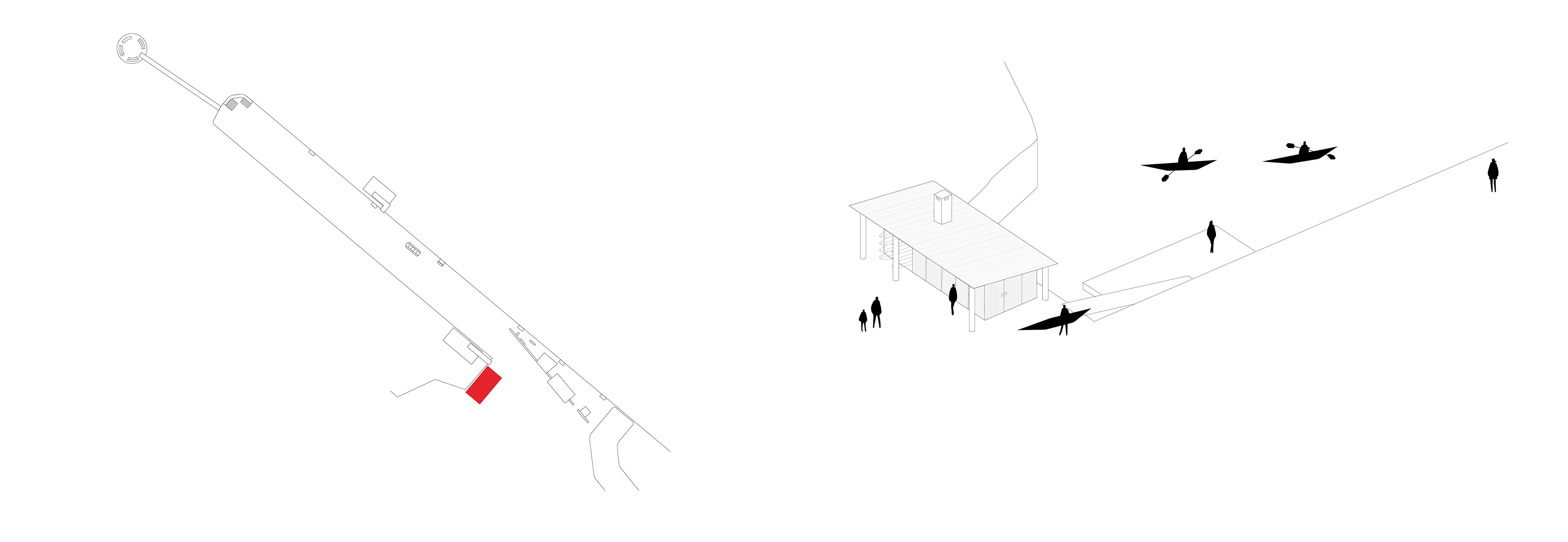The pavilion consists of two parts; an open space with a self-service kayak rental and a pavilion for kayakers. The pavilion can open up towards the new square, offers views of the water and is heated by a wood-burning stove. Here, kayaking activities such as lessons, gatherings, rests or meetings can take place.